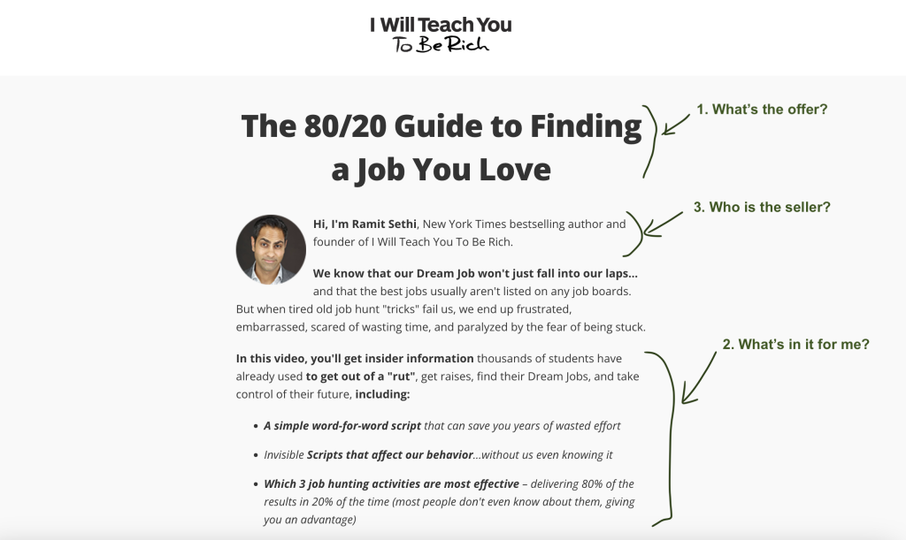 And it does. The first line after the heading, introduces the seller and builds the credibility. It states the name, Ramit Sethi and introduces him as the New York Times bestseller of a personal finance book.