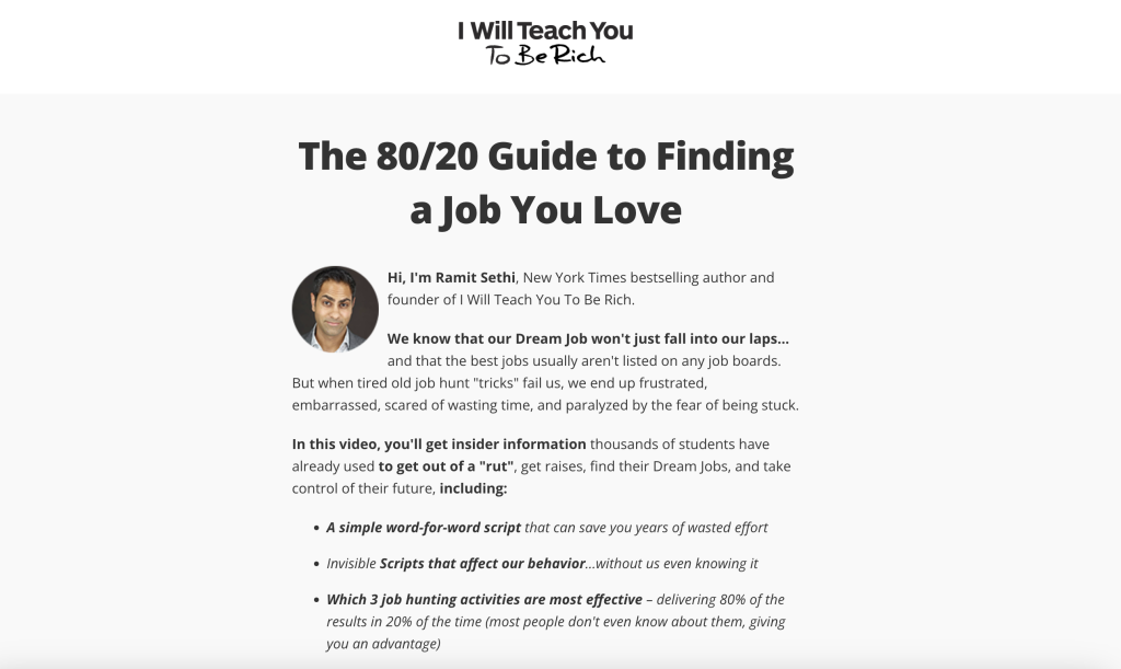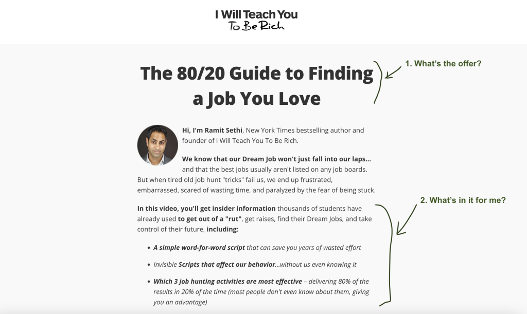 The copy offers an “80/20 guide to finding a job you love”. The headline itself makes it very clear. There is no ambiguity on what the reader is getting from this copy.