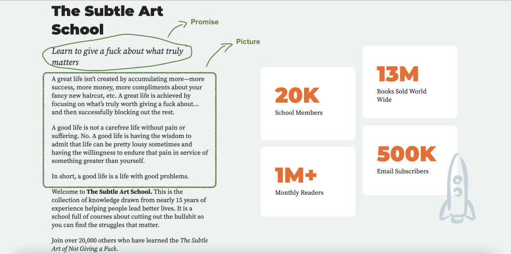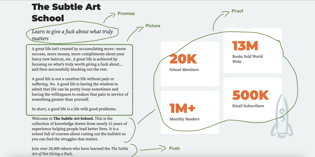 The promise is made using the headline and often the sub-heading. Below is an example of a PPPP framework driven copy from MarkManson’s website. I picked it up from the web archive, since the site has now changed.